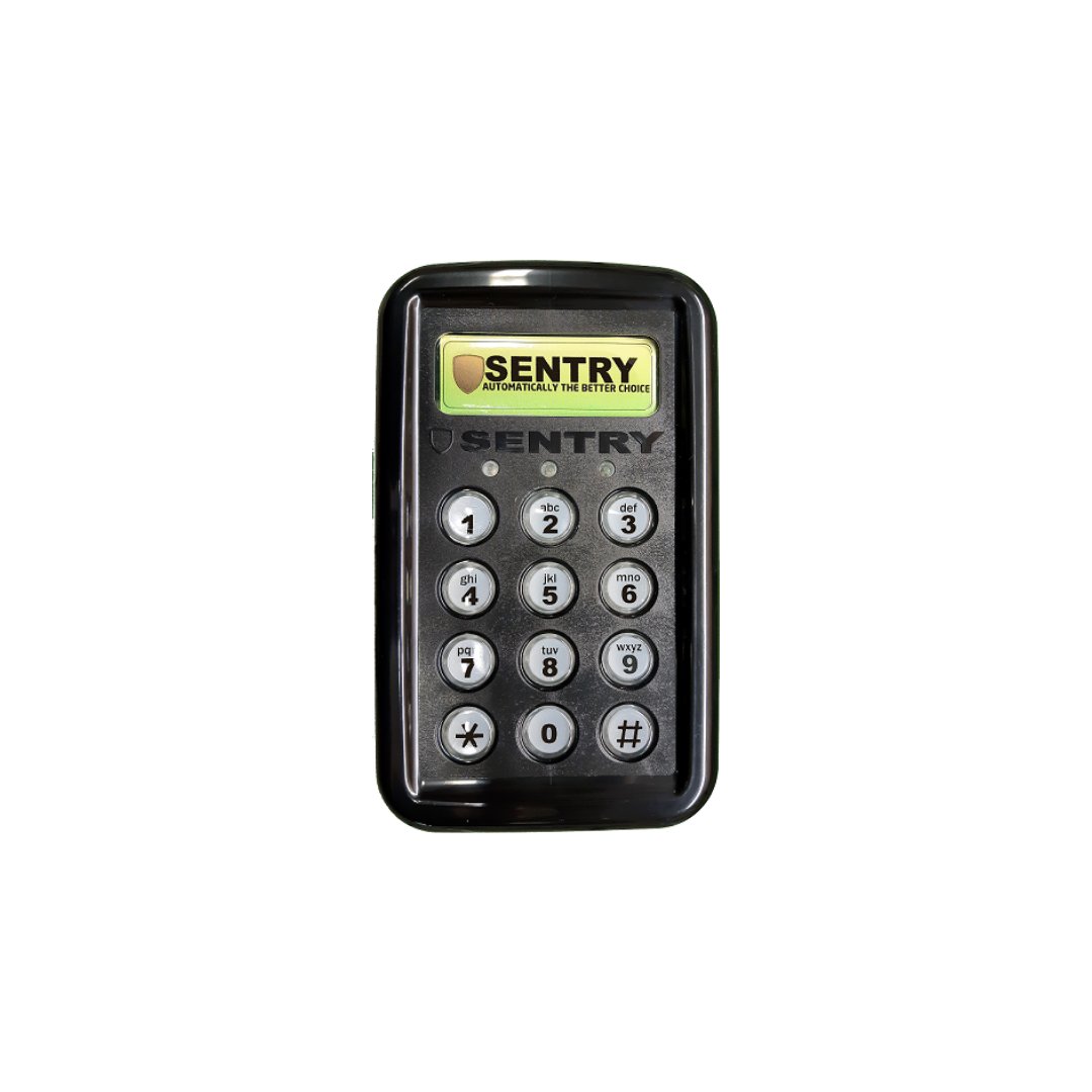 The SENTRY Wireless Access Keypad is a Radio Frequency Access Control Keypad that wirelessly communicates with other security products to provide stand-alone access control for users. The unit can accommodate up to 1000 unique PIN codes with any user-defined length from 1-10 digits. There are 15 channels to activate peripherals with. A memory module is provided for backup and restoring of information.